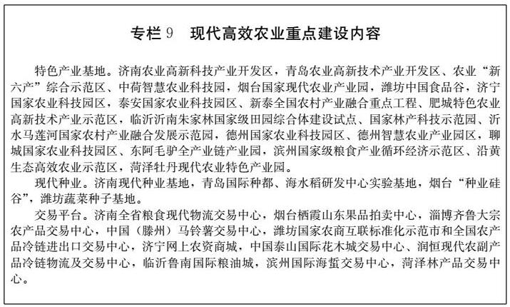 大力發(fā)展特色高效農(nóng)業(yè)。把增加綠色優(yōu)質(zhì)農(nóng)產(chǎn)品擺在突出位置,推進農(nóng)業(yè)標準化生產(chǎn)、全程化監(jiān)管,全面提升農(nóng)產(chǎn)品質(zhì)量安全水平。支持濰坊建設(shè)國家蔬菜標準中心。實施農(nóng)業(yè)科技創(chuàng)新工程和渤海糧倉科技示范工程,加強現(xiàn)代種業(yè)、畜牧良種培育。綜合應(yīng)用工程裝備技術(shù)、生物技術(shù)、信息技術(shù)、環(huán)境技術(shù),加快發(fā)展設(shè)施農(nóng)業(yè)。落實藏糧于地戰(zhàn)略,劃定和建設(shè)糧食生產(chǎn)功能區(qū)和重要農(nóng)產(chǎn)品生產(chǎn)保護區(qū),開展耕地輪作休耕試點,推進高標準農(nóng)田建設(shè),穩(wěn)定提升糧食產(chǎn)能。積極開展農(nóng)業(yè)科技國際合作。高水平建設(shè)黃河三角洲農(nóng)業(yè)高新技術(shù)產(chǎn)業(yè)示范區(qū)、濰坊國家農(nóng)業(yè)開放發(fā)展綜合試驗區(qū)、棗莊國家農(nóng)業(yè)可持續(xù)發(fā)展試驗示范區(qū)。