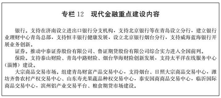 推動金融業(yè)務(wù)創(chuàng)新。加快完善金融市場、金融組織、金融產(chǎn)品和服務(wù)模式,更好滿足實體經(jīng)濟和人民群眾多樣化的金融需求。鼓勵利用互聯(lián)網(wǎng)、大數(shù)據(jù)、人工智能等,進行金融業(yè)務(wù)流程改造和產(chǎn)品創(chuàng)新。積極發(fā)展養(yǎng)老金融、教育金融、文化金融、旅游金融、農(nóng)村金融等新型金融服務(wù)。規(guī)范發(fā)展互聯(lián)網(wǎng)金融、區(qū)塊鏈、人工智能等領(lǐng)域的新型金融業(yè)態(tài)。支持小額貸款公司、典當、融資租賃、商業(yè)保理等金融組織創(chuàng)新、可持續(xù)發(fā)展。統(tǒng)籌發(fā)展介于現(xiàn)貨與期貨之間的大宗商品交易業(yè)務(wù),打造具有全國影響力的交易場所。支持濟南推進新舊動能轉(zhuǎn)換金融創(chuàng)新發(fā)展試點,開展金融服務(wù)實體經(jīng)濟改革創(chuàng)新。支持煙臺開展基金管理服務(wù)專項改革創(chuàng)新,青島建設(shè)財富管理金融綜合改革試驗區(qū)。支持棗莊、臨沂等市開展普惠金融改革創(chuàng)新,探索完善區(qū)域普惠金融服務(wù)體系。支持濰坊建設(shè)文化藝術(shù)金融綜合試驗區(qū)、德州舉辦京津冀魯資本技術(shù)交易大會。