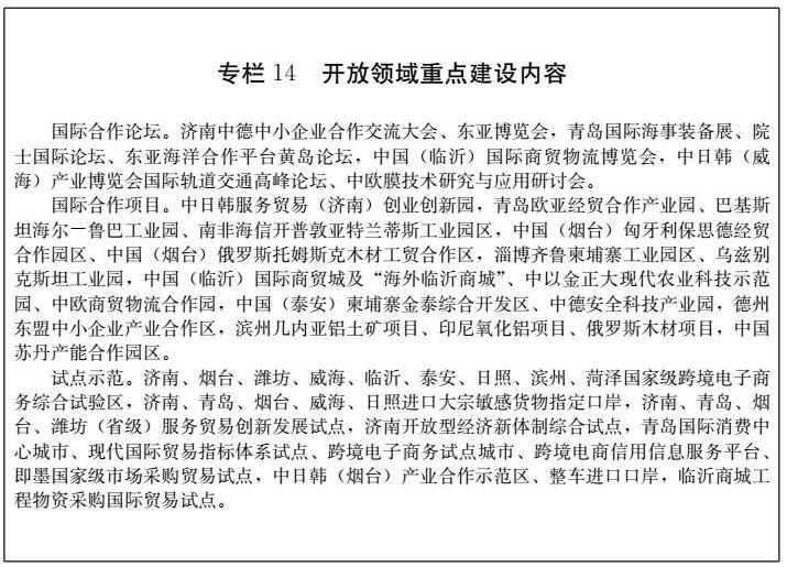 構(gòu)建開放型經(jīng)濟新體制。充分借鑒自由貿(mào)易試驗區(qū)改革試點經(jīng)驗,在濟南、青島、煙臺市,依托國家級新區(qū)、國家級經(jīng)濟技術(shù)開發(fā)區(qū)、國家級高新技術(shù)開發(fā)區(qū)、海關(guān)特殊監(jiān)管區(qū),以及濟南新舊動能轉(zhuǎn)換先行區(qū),加快體制機制創(chuàng)新。支持青島積極創(chuàng)造條件,探索建設(shè)自由貿(mào)易港。支持濟南開展構(gòu)建開放型經(jīng)濟新體制綜合試點。推動濟寧、日照、淄博、青島空港、即墨等綜合保稅區(qū)盡早獲批,支持其他符合條件的市申建海關(guān)特殊監(jiān)管區(qū)域,推進現(xiàn)有海關(guān)特殊監(jiān)管區(qū)域延伸服務(wù)功能。推進威海中韓自貿(mào)區(qū)地方經(jīng)濟合作示范區(qū)、中韓(煙臺)產(chǎn)業(yè)園建設(shè)。全面實行準入前國民待遇加負面清單管理制度,加強外商投資企業(yè)事中事后監(jiān)管,探索“無感知”和“低感知”監(jiān)管方式。推行“服務(wù)大使”制度,加強重點外資企業(yè)點對點直通包辦服務(wù)。擴大服務(wù)業(yè)對外開放,根據(jù)國家部署,有序放開育幼養(yǎng)老、建筑設(shè)計、會計審計、商貿(mào)物流、電子商務(wù)等服務(wù)業(yè)領(lǐng)域準入限制。開展跨境電子商務(wù)人民幣結(jié)算、跨境資產(chǎn)轉(zhuǎn)讓政策創(chuàng)新和融資租賃試點。