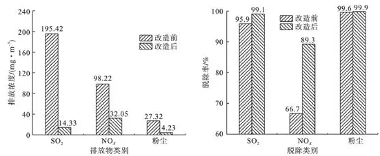 設(shè)備改造之前,煙塵排放濃度為27.32mg/m3,經(jīng)過(guò)改造之后,煙塵排放濃度達(dá)到4.23m/m3,除塵效率有所提高。