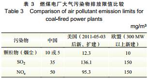 中國燃煤電廠超低排放限值與美國、歐盟燃煤電廠最嚴(yán)格的排放限值比較如表 3 所示[12-13]。