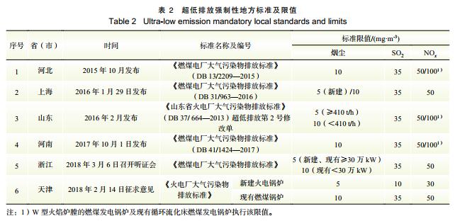 截至發(fā)稿時(shí),已有 6 個(gè)省級政府發(fā)布或即將發(fā)布火電廠或燃煤電廠大氣污染物強(qiáng)制性地方標(biāo)準(zhǔn)[11],將超低排放要求標(biāo)準(zhǔn)化,它們分別是河南、河北、上海、山東、浙江、天津,其中天津市 2018 年 2 月發(fā)布《火電廠大氣污染物排放標(biāo)準(zhǔn)》(征求意見稿),浙江省于 2018 年 3 月 6 日召開了《燃煤電廠大氣污染物排放標(biāo)準(zhǔn)》聽證會,其他 4 個(gè)省份的地方標(biāo)準(zhǔn)均已發(fā)布。上海、山東、浙江對新建鍋爐或一定規(guī)模以上鍋爐的煙塵提出了 5 mg/m3 的燃?xì)鈽?biāo)準(zhǔn)限值要求,其他省份提出的標(biāo)準(zhǔn)限值與國家“超低排放” 限值基本一致,詳見表 2。另外,值得注意的是上海、浙江強(qiáng)制性地方標(biāo)準(zhǔn)中要求燃煤發(fā)電鍋爐應(yīng)采取煙溫控制及其他有效措施消除石膏雨、有色煙雨等現(xiàn)象;浙江省還將排放績效控制要求寫入強(qiáng)制性地方標(biāo)準(zhǔn)中。