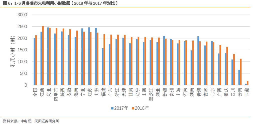 1-6 月,火電利用小時(shí)各月均高于 2017 年水平,改善顯著。多省市火電利用小時(shí)數(shù)同比明顯提升,其中云南 73.1%,福建 38.5%,湖南 28.6%,廣西 27.4%,廣東 23.3%,四川 21.6%。