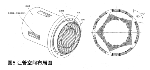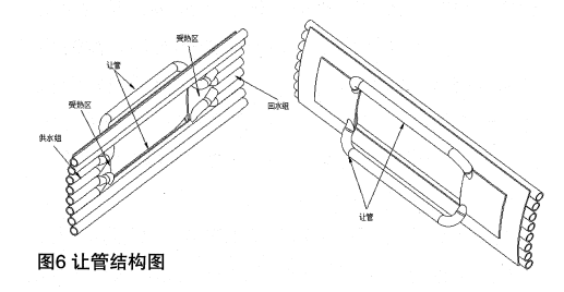 讓管主要是利用彎管將外管排向兩邊移開,同時在外簡體高溫段開設(shè)長方形檢修孔。外管排組由兩根回水管及兩根進水管組成,將外管排兩組供水管二合一為一根供水讓管,兩組回水管二合一為一根回水讓管,讓管靠近簡體外壁,形成一個檢查孔。并以相同的結(jié)構(gòu)在高溫段處開設(shè)5組檢查孔。在開孔后,整個視線空間能覆蓋內(nèi)筒外壁,0-2.5米長度范圍的檢查視野達950,不存在檢修死區(qū)。