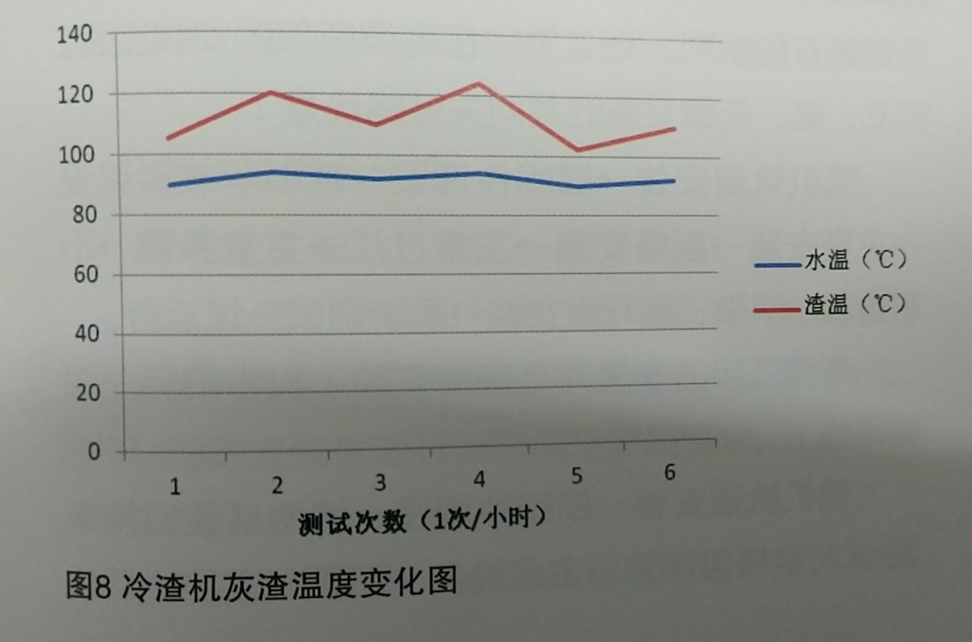 排渣溫度驗證:在3r/min轉(zhuǎn)速下對回水溫度及出渣溫度進行試驗?;厮疁囟炔捎孟到y(tǒng)自帶DCS數(shù)據(jù),出渣溫度采用紅外線測溫儀取渣堆中部溫度,試驗數(shù)據(jù)如圖8。