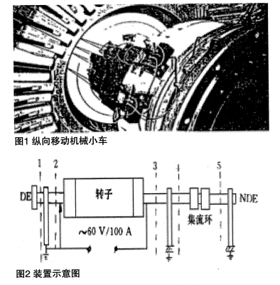 【案例1】華能石洞口二電廠采用ABB開發(fā)的鋼絲牽引沿發(fā)電機(jī)氣隙縱向移動機(jī)械小車見圖1,即可目測發(fā)電機(jī)定,轉(zhuǎn)子鐵芯,槽楔表面和轉(zhuǎn)子護(hù)環(huán)內(nèi)側(cè),又可在“小車”上裝一個可以發(fā)出一定振打力和頻率的”小錘”,通過振動傳感器,將振打槽楔的振幅轉(zhuǎn)換成電信號,由光纜輸送到頻響分析儀作計(jì)算處理,判斷出槽楔松緊度。該方法明顯優(yōu)于抽轉(zhuǎn)子后的人工測量,規(guī)避了發(fā)電機(jī)抽轉(zhuǎn)子檢測槽楔和鐵芯的盲目性,降低了大修風(fēng)險。應(yīng)用這套裝置成功的發(fā)現(xiàn)該廠#1機(jī)轉(zhuǎn)子第E槽中部一塊槽楔斷裂。