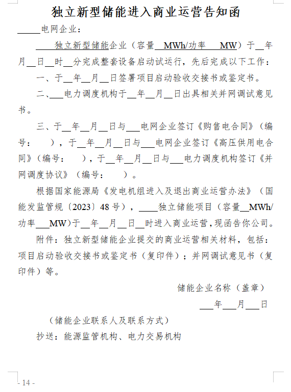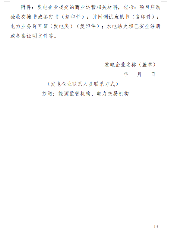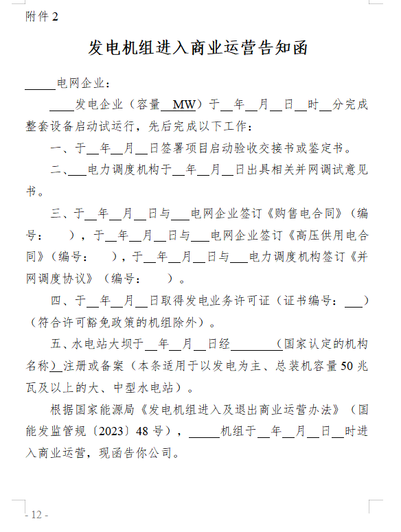 第十一條 在完成整套設(shè)備啟動(dòng)試運(yùn)行后3個(gè)月內(nèi)(風(fēng)電、光伏發(fā)電項(xiàng)目在并網(wǎng)后6個(gè)月內(nèi)),擁有發(fā)電機(jī)組、獨(dú)立新型儲(chǔ)能的市場(chǎng)主體分別具備第八條、第九條商業(yè)運(yùn)營(yíng)條件后,以正式文件將進(jìn)入商業(yè)運(yùn)營(yíng)情況(附件2格式)及相關(guān)材料報(bào)送電網(wǎng)企業(yè),從完成整套設(shè)備啟動(dòng)試運(yùn)行時(shí)間點(diǎn)起自動(dòng)進(jìn)入商業(yè)運(yùn)營(yíng)。