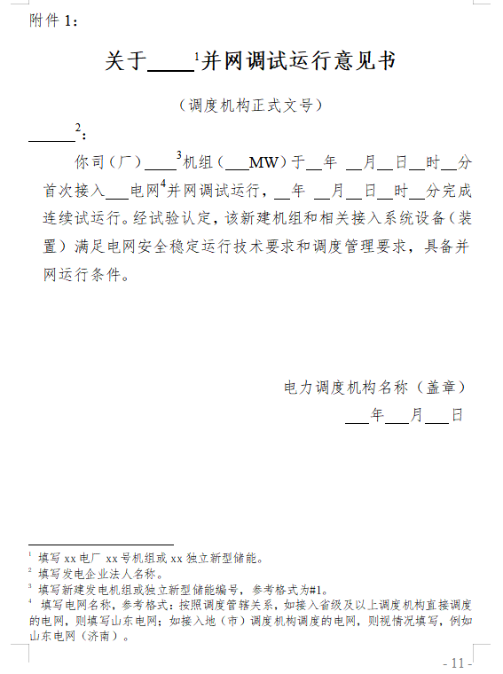 第六條 電力調(diào)度機(jī)構(gòu)應(yīng)建立并公開(kāi)發(fā)電機(jī)組和獨(dú)立新型儲(chǔ)能并網(wǎng)調(diào)試有關(guān)工作制度或業(yè)務(wù)指導(dǎo)書(shū),明確辦理并網(wǎng)調(diào)試業(yè)務(wù)的有關(guān)工作部門(mén)、工作流程、工作時(shí)限、需要提交的材料清單及技術(shù)要求等。電力調(diào)度機(jī)構(gòu)按附件1格式出具并網(wǎng)調(diào)試運(yùn)行意見(jiàn)書(shū)。
