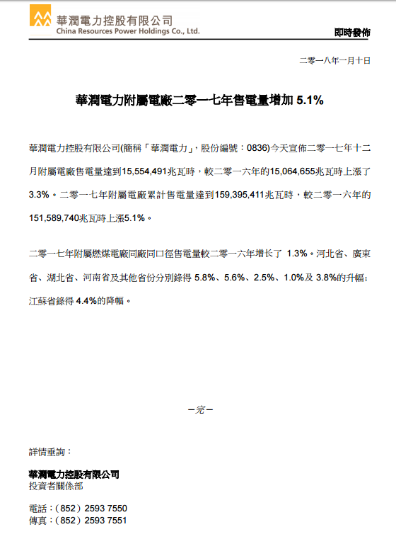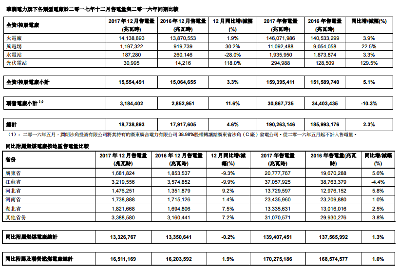 華潤(rùn)電力2017年12月附屬火電廠售電量同比增長(zhǎng)3.9%