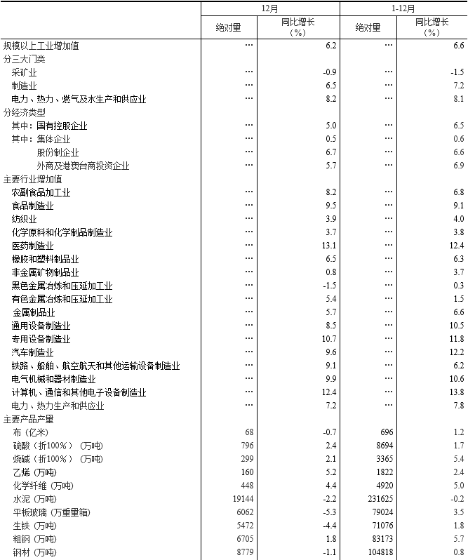 分行業(yè)看,12月份,41個大類行業(yè)中有35個行業(yè)增加值保持同比增長。其中,農副食品加工業(yè)增長8.2%,紡織業(yè)增長3.9%,化學原料和化學制品制造業(yè)增長3.7%,非金屬礦物制品業(yè)增長0.8%,黑色金屬冶煉和壓延加工業(yè)下降1.5%,有色金屬冶煉和壓延加工業(yè)增長5.4%,通用設備制造業(yè)增長8.5%,專用設備制造業(yè)增長10.7%,汽車制造業(yè)增長9.6%,鐵路、船舶、航空航天和其他運輸設備制造業(yè)增長9.1%,電氣機械和器材制造業(yè)增長9.9%,計算機、通信和其他電子設備制造業(yè)增長12.4%,電力、熱力生產和供應業(yè)增長7.2%。
