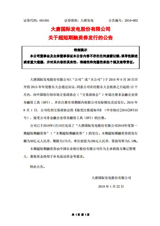 大唐發(fā)電發(fā)布公告,公司已于2018年1月19日完成了大唐國際發(fā)電股份有限公司2018年度第一期超短期融資券的發(fā)行。該期超短期融資券的發(fā)行額為3