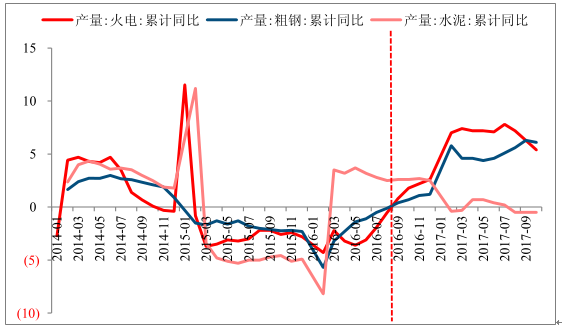 煤炭需求端的企穩(wěn)回暖始于 2016 年三季度。作為煤炭下游需求側(cè)的重要工業(yè)領(lǐng)域,以電力和鋼鐵行業(yè)為主的下游產(chǎn)量回暖,在一定程度上有效提升了煤炭需求。在經(jīng)歷了 2015 及 2016 上半年產(chǎn)量的連續(xù)下行期后,自2016 年三季度起我國(guó)火電發(fā)電量和粗鋼產(chǎn)量累計(jì)同比數(shù)據(jù)開(kāi)始轉(zhuǎn)向正增長(zhǎng),并且在進(jìn)入 17 年后,需求也整體維持高位,截至 2017 年 10 月火電發(fā)電量累計(jì)同比增長(zhǎng) 5.4%,粗鋼產(chǎn)量累計(jì)同比增長(zhǎng) 6.1%。