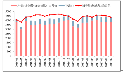 分煤種來(lái)看,進(jìn)入 2017 年后無(wú)論是動(dòng)力煤還是煉焦煤,基本呈現(xiàn)出供需緊平衡的態(tài)勢(shì)。從消費(fèi)量來(lái)看,動(dòng)力煤消費(fèi)量高點(diǎn)出現(xiàn)在 7 月,月度消費(fèi)量達(dá)到 2.77 億噸;煉焦煤消費(fèi)量高點(diǎn)則出現(xiàn)在 6 月,月度消費(fèi)量 4590萬(wàn)噸。供需對(duì)比方面,從進(jìn)入 6 月份夏季消費(fèi)旺季開(kāi)始,動(dòng)力煤供需缺口(總供給-總需求)開(kāi)始出現(xiàn)并在 7、8月份達(dá)到峰值-2676 萬(wàn)噸和-1512 萬(wàn)噸;煉焦煤方面則相對(duì)均衡一些,并未出現(xiàn)較大的供需缺口供需整體相對(duì)平衡。