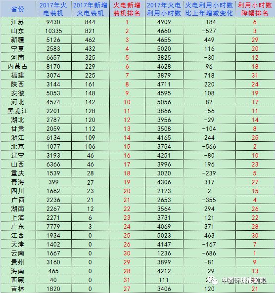 2017年分省火電新增裝機及火電利用小時數(shù)與上年增減情況對比
