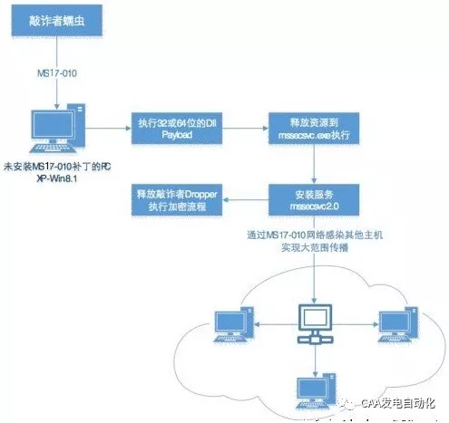 經(jīng)過對(duì)多方求證和數(shù)據(jù)重組分析得出,明確該病毒使用ms17-010漏洞進(jìn)行了傳播,一旦某臺(tái)Windows系統(tǒng)主機(jī)中毒,相鄰的存在漏洞的網(wǎng)絡(luò)主機(jī)都會(huì)被其主動(dòng)攻擊,整個(gè)網(wǎng)絡(luò)都可能被感染該蠕蟲病毒,受害感染主機(jī)數(shù)量最終將呈幾何級(jí)的增長(zhǎng)。其完整攻擊流程如下該病毒攻擊流程如下: