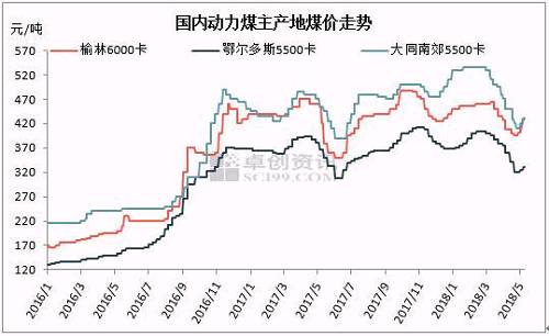 目前動力煤主產(chǎn)地“三西”地區(qū)煤價整體呈穩(wěn)中有漲的態(tài)勢運行,各地煤礦銷售情況好轉(zhuǎn),價格均出現(xiàn)10-20元/噸的反彈,其中以陜西榆林地區(qū)煤價上漲最為頻繁。以神木某煤礦為例,截至2018年5月9日熱量5800大卡末煤坑口含稅價執(zhí)行410元/噸,進入5月份以后該礦煤價累計上調(diào)30元/噸?;仡?017年5月份該礦末煤價格持續(xù)下行的態(tài)勢,且下跌幅度較大,5月初末煤價格執(zhí)行440元/噸,5月底煤價執(zhí)行350元/噸,較月初相比累計下調(diào)90元/噸。