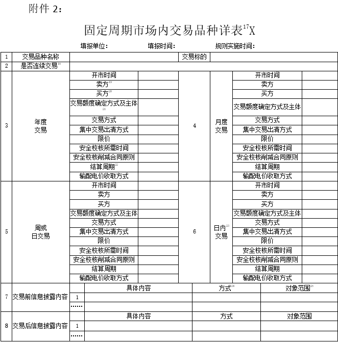 17.本表按周期性進(jìn)行交易的市場內(nèi)交易標(biāo)的品種填寫,一個(gè)交易品種填寫一張,例如直接交易、合同轉(zhuǎn)讓交易、調(diào)峰交易等。交易標(biāo)的主要指時(shí)標(biāo)電量、電量、輔助服務(wù)、合同約定電量(電力、輔助服務(wù))等。如有以年度交易方案等交易規(guī)則性質(zhì)文件的,則按年度填寫,每個(gè)年度方案對(duì)應(yīng)一張表。