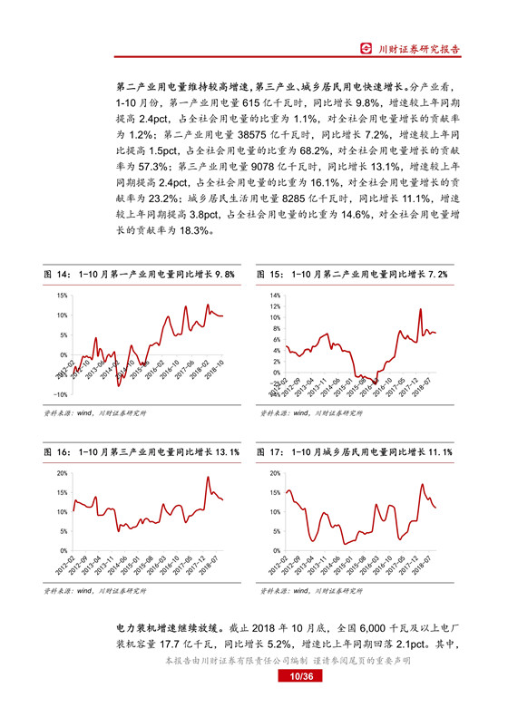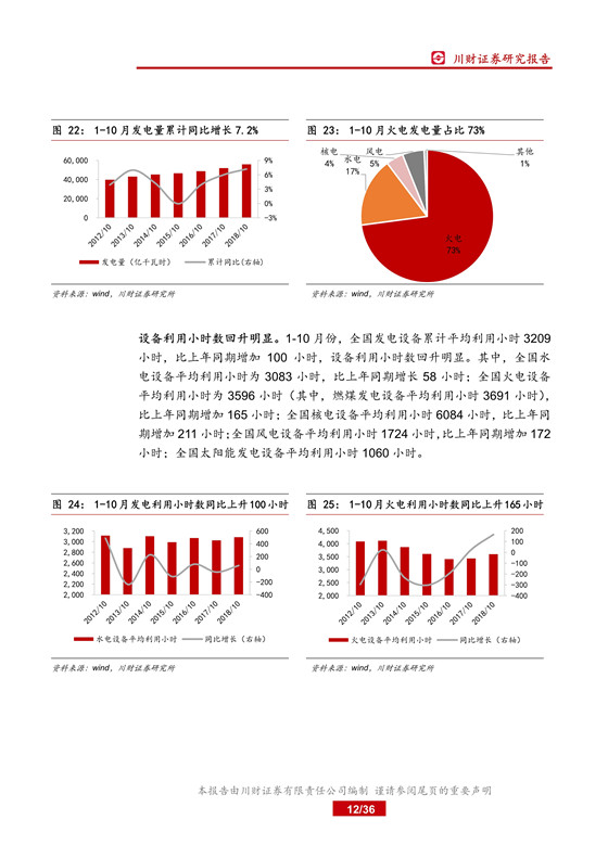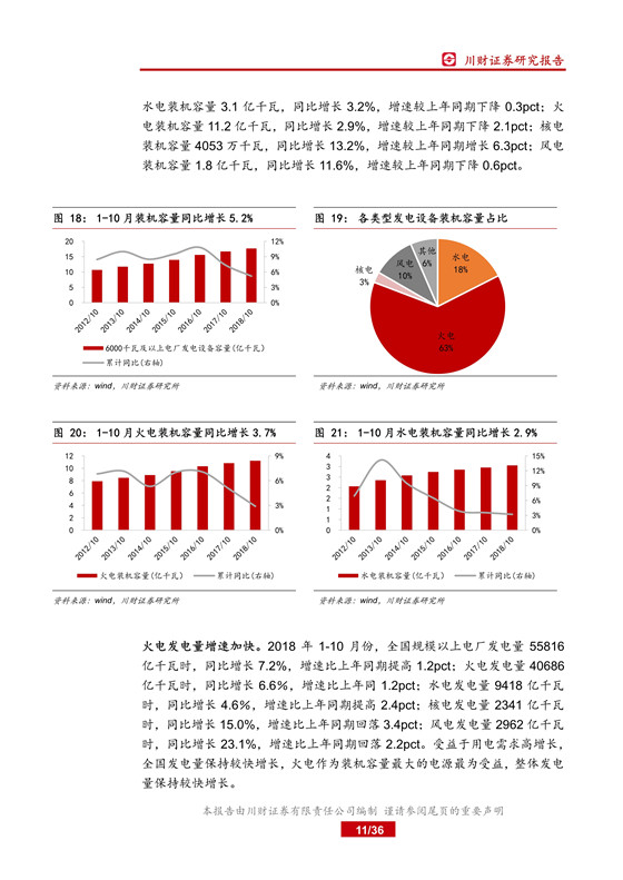 2018 年 1-10 月份,全社會用電量同比增長 8.7%,增速比上年同期提高 2.0pct;全國 6,000 千瓦及以上電廠裝機容量同比增長 5.2%,增速較上年同期回落2.1pct;全國發(fā)電設備累計平均利用小時 3209 小時,比上年同期增加 100 小時,電力供需失衡繼續(xù)緩解,行業(yè)景氣度持續(xù)提升。