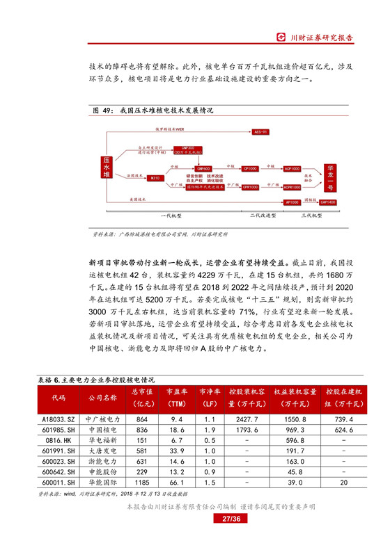 核電消納情況向好, 利用小時提升帶動機組利用率提高,同時發(fā)電量增長有望抵消市場化交易折價, 盈利能力持續(xù)改善。 2018 年全球首個 AP1000 機組-三門核電兩臺機組建成投產(chǎn),全球首臺 EPR 機組-臺山核電 1 號機組亦已商運,華龍一號項目建設穩(wěn)步推進,核電建設明顯加快。 隨著第三代核電機組成功商運,核電技術障礙基本掃除,同時惠州、漳州等多個新項目已具備開工條件,新項目審批有望落地,行業(yè)將迎來新一輪發(fā)展, 相關公司為中國核電、浙能電力。