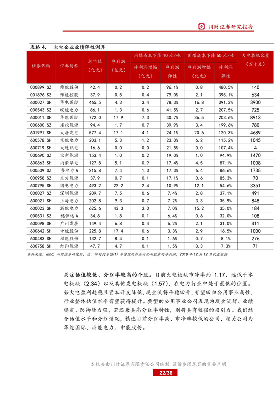 受益于全社會用電量快速增長,火電發(fā)電量有望保持穩(wěn)定增長, 同時市場化交易價差持續(xù)縮窄,火電收入方面有望保持量價齊升; 去產(chǎn)能任務完成、新增產(chǎn)能逐漸釋放,煤炭供給趨于寬松, 隨著鐵路運力持續(xù)改善,煤炭價格有望平穩(wěn)回落,火電成本有望穩(wěn)中有降,業(yè)績有望觸底反彈。 在煤炭價格平穩(wěn)回落、“基準電價+浮動機制” 定價模式以及煤電聯(lián)營等多因素催化下,火電業(yè)績回升后有望企穩(wěn), 逐漸回歸公用事業(yè)屬性。 我們從業(yè)績彈性和高分紅兩條主線精選個股, 相關公司為華能國際、華電國際、皖能電力、申能股份。