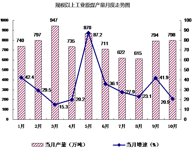 自年初以來(lái),全盟原煤產(chǎn)量持續(xù)穩(wěn)定增長(zhǎng)。1-10月生產(chǎn)原煤7482萬(wàn)噸,同比增加1721萬(wàn)噸,增長(zhǎng)29.9%;10月份,原煤產(chǎn)量798萬(wàn)噸,同比增長(zhǎng)20.9%,增速比9月份回落21.0個(gè)百分點(diǎn)。