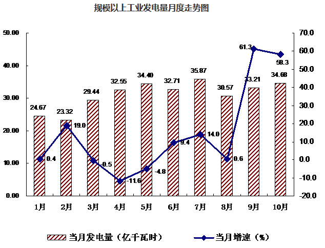 10月份,全盟電力行業(yè)受火電影響,發(fā)電量大幅增長(zhǎng)。實(shí)現(xiàn)發(fā)電量34.68億千瓦時(shí),較上年同期增加12.77億千瓦時(shí),同比增長(zhǎng)58.2%,比9月份回落3.0個(gè)百分點(diǎn)。1-10月份,累計(jì)完成發(fā)電量313.22億千瓦時(shí),同比增加32.21億元,同比增長(zhǎng)11.5%。