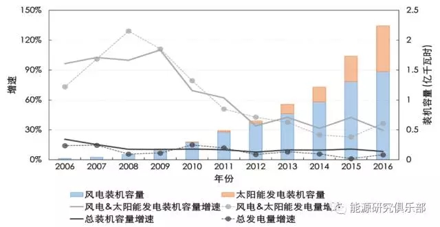 圖2 中國風電、太陽能發(fā)電裝機及發(fā)電量增速情況