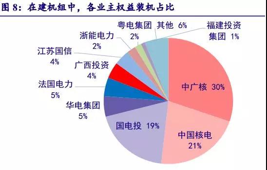 已投運(yùn)的37臺(tái)機(jī)組中,全部由中核和中廣核兩家集團(tuán)控股。中電投與國(guó)核技合并后的國(guó)電投集團(tuán)成為第三家核電巨頭。三家企業(yè)權(quán)益裝機(jī)在已投運(yùn)機(jī)組中比例為71.1%,其中中廣核40.7%,中核21.7%,國(guó)電投8.7%;在建機(jī)組中的比例為71.0%,其中中廣核30.3%,中核21.5%,國(guó)電投19.2%。