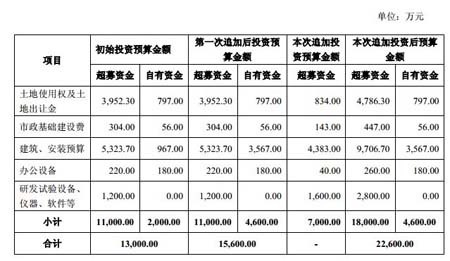 根據(jù)“智能配電網(wǎng)技術(shù)研發(fā)中心及公司總部項(xiàng)目”目前建設(shè)需求,現(xiàn)使用超募資金7,000萬元對(duì)項(xiàng)目第二次追加投資,本次追加投資后項(xiàng)目總投資額增至22,600萬元。本次追加的投資主要用于建筑工程投資、研發(fā)試驗(yàn)設(shè)備儀器軟件、土地使用權(quán)及土地出讓金、市政基礎(chǔ)建設(shè)費(fèi)、辦公設(shè)備等。本次追加投資前后,該項(xiàng)目投資預(yù)算資金情況如下: