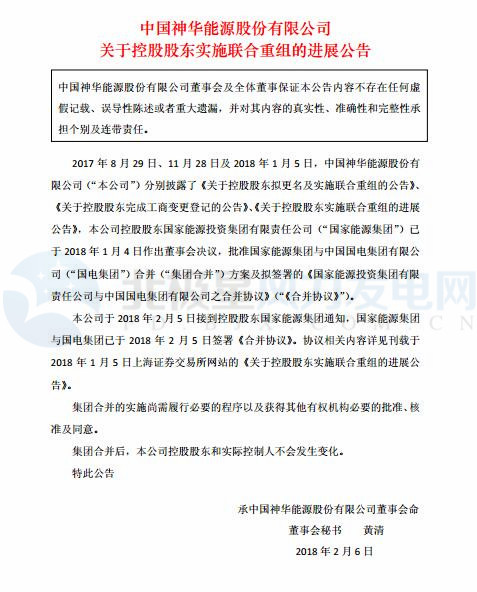 中國(guó)神華2月5日晚間發(fā)布公告,該公司于2018年2月5日接到控股股東國(guó)家能源集團(tuán)通知,國(guó)家能源集團(tuán)與國(guó)電集團(tuán)已于2018年2月5日簽署合并協(xié)議,