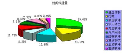 從網(wǎng)絡(luò)新聞傳播(以百度新聞搜索為參考)的角度來(lái)看,通達(dá)信科的傳播量最高,占前十強(qiáng)總量的29.06%,其次是泛微,新聞傳播量達(dá)16.92%,致遠(yuǎn)軟件以12.65%的占比次之。