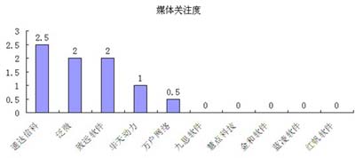 在媒體關(guān)注度方面,通達(dá)信科以2.5的指數(shù)居首,泛微和致遠(yuǎn)軟件的媒體關(guān)注度指數(shù)均為2,華天動(dòng)力的媒體關(guān)注度指數(shù)為1,萬(wàn)戶網(wǎng)絡(luò)的媒體關(guān)注度為0.5。而九思軟件、慧點(diǎn)科技、金和軟件、藍(lán)凌軟件、紅帆軟件的媒體關(guān)注度指數(shù)則為0。