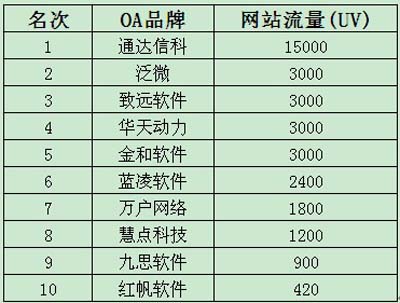 從網(wǎng)站流量來(lái)看,通達(dá)信科依然15000UV高居榜首;泛微、致遠(yuǎn)軟件、華天動(dòng)力、金和軟件的流量均為3000UV;藍(lán)凌軟件、萬(wàn)戶網(wǎng)絡(luò)、慧點(diǎn)科技、九思軟件、紅帆軟件分別位居第6-10位。