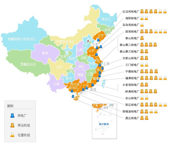 中國大陸核電站分布圖
