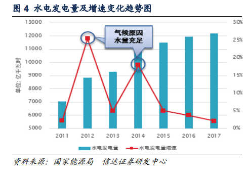 我們預(yù)測(cè),2018年,全社會(huì)用電量增速6%的情況下,全社會(huì)用電量增長(zhǎng)約為4000億千瓦時(shí),按照各類電源發(fā)電量結(jié)構(gòu)測(cè)算,煤電增長(zhǎng)約2640億千瓦時(shí),折合成標(biāo)煤約為3245萬(wàn)噸,也就是說(shuō)對(duì)應(yīng)原煤消費(fèi)增長(zhǎng)4543萬(wàn)噸,引發(fā)煤炭消費(fèi)部分修復(fù);相應(yīng)水電發(fā)電量增長(zhǎng)約800億千瓦時(shí),氣電、并網(wǎng)風(fēng)電發(fā)電量增長(zhǎng)200億千瓦時(shí),并網(wǎng)太陽(yáng)能發(fā)電、核電發(fā)電量增長(zhǎng)80億千瓦時(shí)左右。