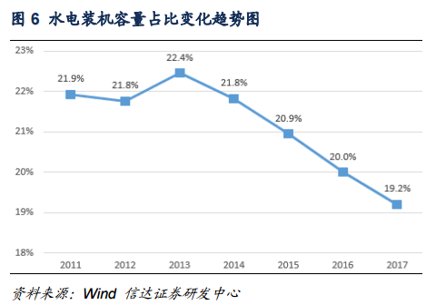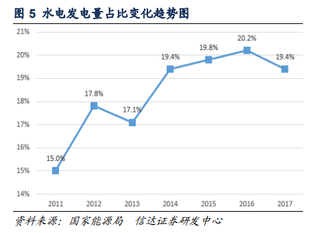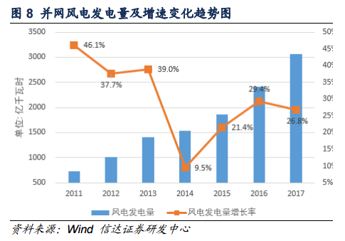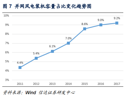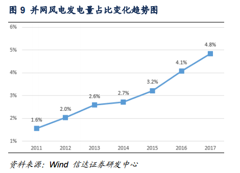 從發(fā)電量角度而言,2017年水電發(fā)電量約為12211億千萬(wàn)時(shí),水電發(fā)電量增速由2016年的3.8%降至2.2%,水電發(fā)電量在全國(guó)全社會(huì)用電量中的占比也由2016年的20.2%降至2017年的19.4,這主要是因?yàn)樽罱鼉赡隁夂蛟驅(qū)е碌乃坎粔虺渥?,未?lái)我們預(yù)計(jì)水電發(fā)電量在全社會(huì)用電量中的占比將維持在20%左右;近年來(lái),風(fēng)電裝機(jī)容量在發(fā)電設(shè)備裝機(jī)總量中的占比不斷提高,2017年,風(fēng)電發(fā)電量約為3057億千瓦時(shí),約占全社會(huì)用電量的4.8%,并網(wǎng)風(fēng)電裝機(jī)容量占比達(dá)到9.2%,整體上呈現(xiàn)逐漸上升的趨勢(shì)。