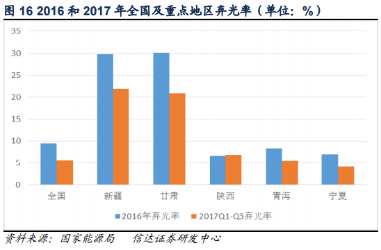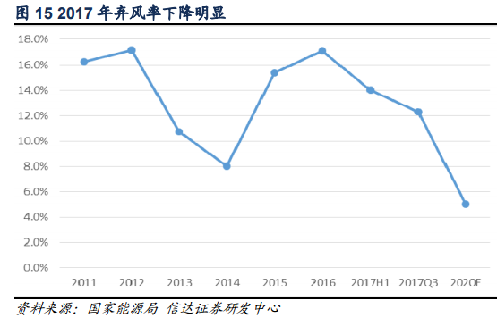 2017年,我國(guó)重點(diǎn)省份及主要河流(河段)利用良好,除了金沙江中游和大渡河地區(qū)水能利用率不到70%,其他地區(qū)和河流水能利用率都在85%以上;2017年,棄風(fēng)問(wèn)題有所緩解,全國(guó)風(fēng)電發(fā)電量3057億千瓦時(shí),設(shè)備平均利用小時(shí)1948小時(shí)、同比提高203小時(shí)。棄風(fēng)電量419億千瓦時(shí),同比減少78億千瓦時(shí)。2017年,全國(guó)光伏發(fā)電量1568.2億千瓦時(shí),全國(guó)棄光電量73億千瓦時(shí)。全國(guó)棄光率5.6%,同比下降了3.8個(gè)百分點(diǎn)。可以看出,2017年的棄風(fēng)、棄光情況較2016年下降了不少,但離國(guó)家規(guī)劃的2020年棄風(fēng)率5%以內(nèi)、棄光率3%以內(nèi)的目標(biāo)還有一定距離。隨著棄水棄風(fēng)棄光問(wèn)題的解決,煤電發(fā)電份額將下降。