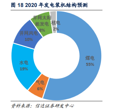 2018年能源工作會(huì)議提出,要聚焦綠色發(fā)展,著力解決清潔能源消納問(wèn)題。按照非化石能源消費(fèi)比重達(dá)到15%左右的要求,到2020年,非化石能源發(fā)電裝機(jī)將達(dá)到7.7億千瓦左右,按照煤電“去產(chǎn)能”及清潔能源消納的相關(guān)政策要求,我們預(yù)測(cè),到2020年:全國(guó)發(fā)電裝機(jī)容量約為20億千瓦,其中煤電裝機(jī)容量不會(huì)超過(guò)11億千瓦,氣電裝機(jī)容量將達(dá)到1.2億千瓦,常規(guī)水電裝機(jī)將達(dá)到3.7億千瓦,風(fēng)電裝機(jī)將達(dá)到2.1億千瓦,太陽(yáng)能發(fā)電裝機(jī)將達(dá)到1.5億千瓦,核電裝機(jī)將達(dá)到0.5億千瓦,非化石能源發(fā)電裝機(jī)總量將達(dá)到7.8億千瓦左右。到2020年,煤電的電源結(jié)構(gòu)占比將由2017年的58%降至55%,煤電“去產(chǎn)能”將微調(diào)電源結(jié)構(gòu)。