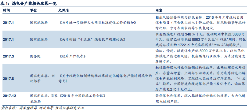 煤電“去產(chǎn)能”首次提出是在2017年政府工作報(bào)告中,當(dāng)時(shí),將“去產(chǎn)能”范圍首次擴(kuò)大到煤電領(lǐng)域。2017年8月,國(guó)家發(fā)改委等16部委聯(lián)合印發(fā)《關(guān)于推進(jìn)供給側(cè)結(jié)構(gòu)性改革防范化解煤電產(chǎn)能過(guò)剩風(fēng)險(xiǎn)的意見(jiàn)》,提出化解煤電產(chǎn)能過(guò)剩等政策。國(guó)家發(fā)改委、能源局接連下發(fā)多份重要文件,提出要“取消一批、緩核一批、緩建一批”,煤電“去產(chǎn)能”明確要求:“十三五”期間,全國(guó)停建和緩建煤電產(chǎn)能1.5億千瓦,淘汰落后產(chǎn)能2000萬(wàn)千瓦以上。到2020年煤電裝機(jī)總規(guī)??刂圃?1億千瓦以內(nèi)。