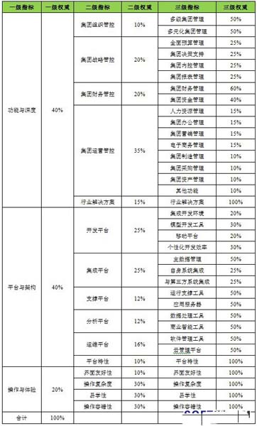 功能與深度指標主要從集團管理軟件產品自身功能的完備性,以及具體應用設計涵蓋的深度兩方面對于集團管理軟件產品進行考量。對于集團企業(yè)來說,集團管控是非常重要的,基于此把具體二級指標分成了五個細項,分別是:集團組織管控、集團戰(zhàn)略管控、集團財務管控、集團運營管控、行業(yè)解決方案。每個二級指標下面還有體現(xiàn)具體功能的三級指標。三級考證指標分別是:集團組織管控下的多級集團管理與多元化集團管理;集團戰(zhàn)略管控下的全面預算管理、集團決策支持、集團內控管理以及集團報表管理;集團財務管控下的集團財務管理、集團資金管理;集團運營管控下的人力資源管理、集團辦公管理、集團營銷管理、電子商務管理、集團制造管理、集團采購管理、集團資產管理以及其他功能。