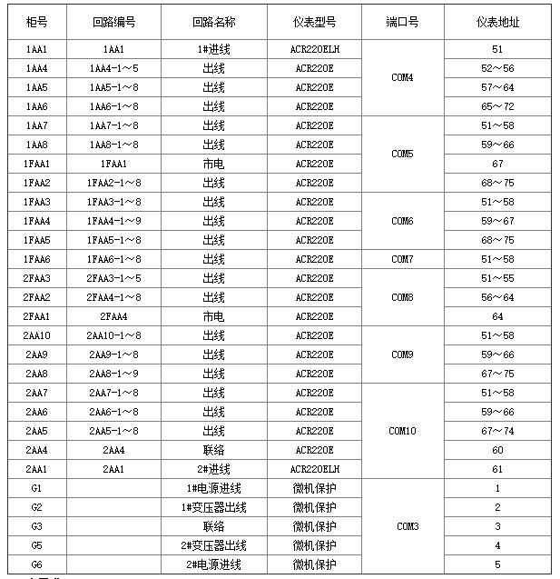 網(wǎng)球中心整個(gè)配電系統(tǒng)分為高低壓兩個(gè)部分,分別位于高壓變電所及低壓變電所,智能電力監(jiān)控系統(tǒng)位于配電室旁邊的電力監(jiān)控值班室。其中高壓配電室共計(jì)5個(gè)回路,分別為10kV進(jìn)線、10kV進(jìn)線2、1#變壓器出線、2#變壓器出線及聯(lián)絡(luò);低壓變電所共計(jì)145個(gè)回路,分別采用ACR220E及ACR220ELH,其中ACR220ELH安裝于低壓進(jìn)線及發(fā)電機(jī)進(jìn)線中。詳細(xì)清單如表一所示: