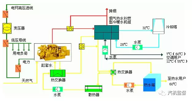 燃?xì)鈨?nèi)燃機(jī)與溴化鋰制冷機(jī)一般采用一對一的單元制配置,它們均需要冷卻水來維持它們的正常循環(huán)工作,其中燃?xì)鈨?nèi)燃機(jī)的冷卻水中分缸套水與中溫水,前者出口溫度一般為95℃左右,可用來供熱,而后者出口一般為60℃左右,一般不再利用;溴化鋰制冷機(jī)的冷卻水一般也不再利用,可通過機(jī)力通風(fēng)設(shè)備散熱后循環(huán)使用。
