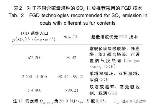 對(duì)于燃用不同含硫量煤種,表2為SO2排放達(dá)到超低排放要求時(shí)本研究推薦采用的FGD技術(shù),這對(duì)火電廠有很好的指導(dǎo)意義。