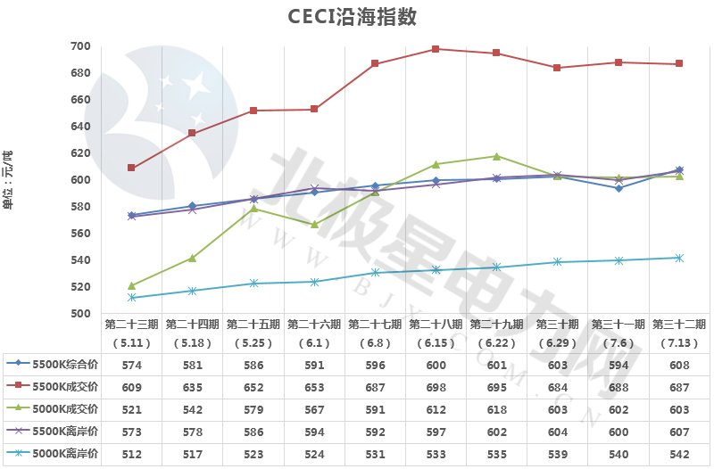 今日,中電聯(lián)公布中國(guó)沿海電煤采購(gòu)價(jià)格指數(shù)(CECI沿海指數(shù))第32期數(shù)據(jù):本期電煤價(jià)格除5500大卡電煤成交價(jià)小幅下跌-1元 噸外,其他電煤價(jià)格