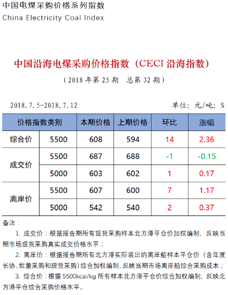 今日,中電聯(lián)公布中國(guó)沿海電煤采購(gòu)價(jià)格指數(shù)(CECI沿海指數(shù))第32期數(shù)據(jù):