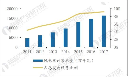 2011年-2017年風(fēng)電累計裝機(jī)和占比