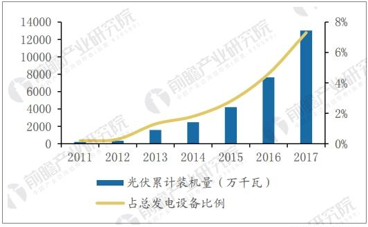 據(jù)前瞻產(chǎn)業(yè)研究院發(fā)布的《售電公司發(fā)展模式與投資戰(zhàn)略規(guī)劃分析報告》數(shù)據(jù)顯示, 2017年我國風(fēng)電累計裝機(jī)量為1.64億千瓦,占全部發(fā)電設(shè)備裝機(jī)容量的9.2%,全年發(fā)電量為3057億千瓦時,占總發(fā)電量的4.8%,同比增長26.90%;2017年全國光伏累計裝機(jī)1.30億千瓦,占總裝機(jī)容量的7.3%,全年發(fā)電量1182億千瓦時,占總發(fā)電量的1.8%,同比增長77.74%。