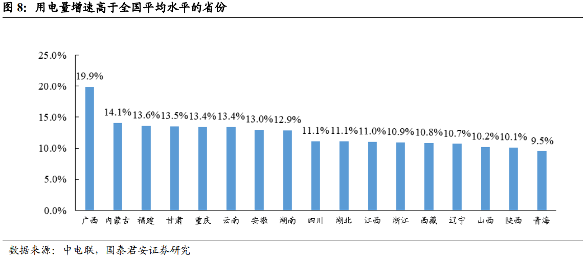 各省 1-6 月全國各省份全社會用電量均實現(xiàn)正增長。其中,全社會用電量增速高于全國平均水平(9.4%)的省份有 17 個。