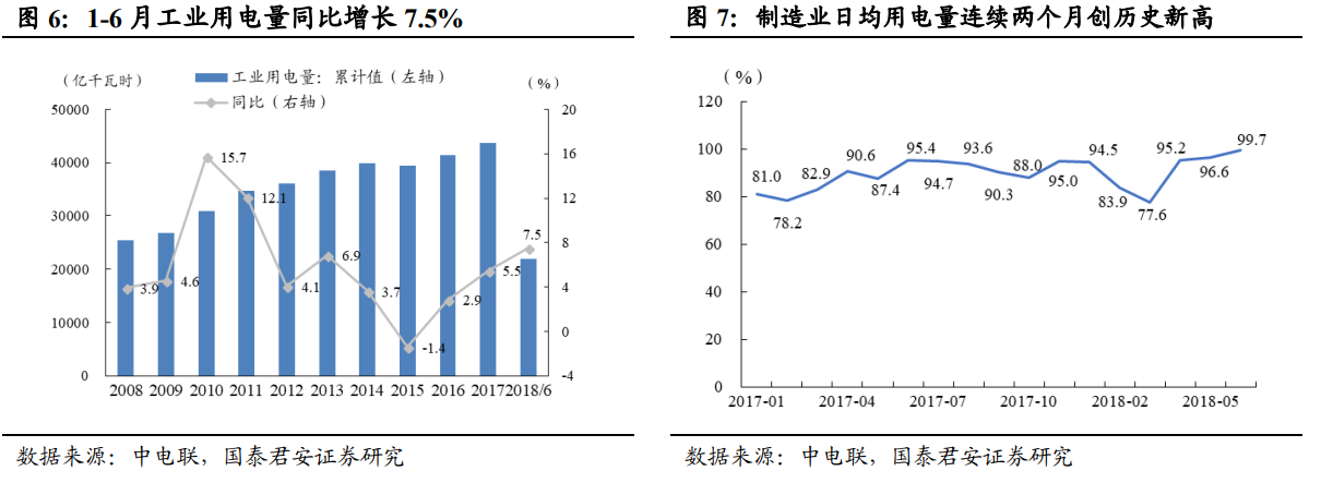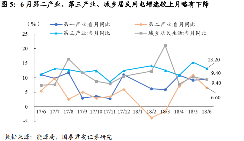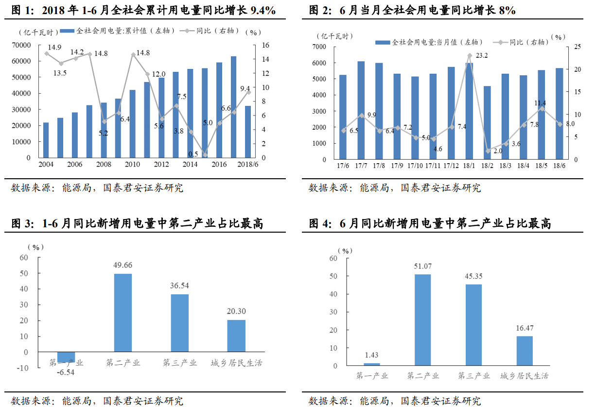 6 月份全社會用電量同比增長 8.0%,1-6 月用電量增速創(chuàng)六年新高。6 月份全社會用電量 5663 億千瓦時,同比增長 8.0%,增速較 5 月下滑 3.4 個百分點。其中第一、第二、第三、城鄉(xiāng)居民生活用電分別同比增長 9.4%、 6.6%、13.2%、9.4%,增速較上月分別變動 0.26、-4.26、-2.08、-0.94 個百分點。6 月用電量略有回落主要由于 6 月份第二產(chǎn)業(yè)用電用電有所下滑,6 月規(guī)模以上工業(yè)增加值同比增長 6.0%,較 5 月份回落 0.8 個百分點。但上半年總體來看,工業(yè)生產(chǎn)形勢較好,1-6 月規(guī)模以上工業(yè)增加值同比增長 6.7%,全國工業(yè)用電量同比增長 7.5%;此外 5、6 月連續(xù)兩個月高溫天氣,全國平均氣溫較常年同期均偏高 0.8℃,為僅次于 2005 年的歷史第二高,高溫拉動第三產(chǎn)業(yè)和城鄉(xiāng)居民生活用電快速增長,1-6 月第三產(chǎn)業(yè)和城鄉(xiāng)居民生活用電分別同比增長 14.7%、13.2%;上述因素影響之下,上半年全社會用電量同比增長 9.4%,增速創(chuàng)六年新高。?