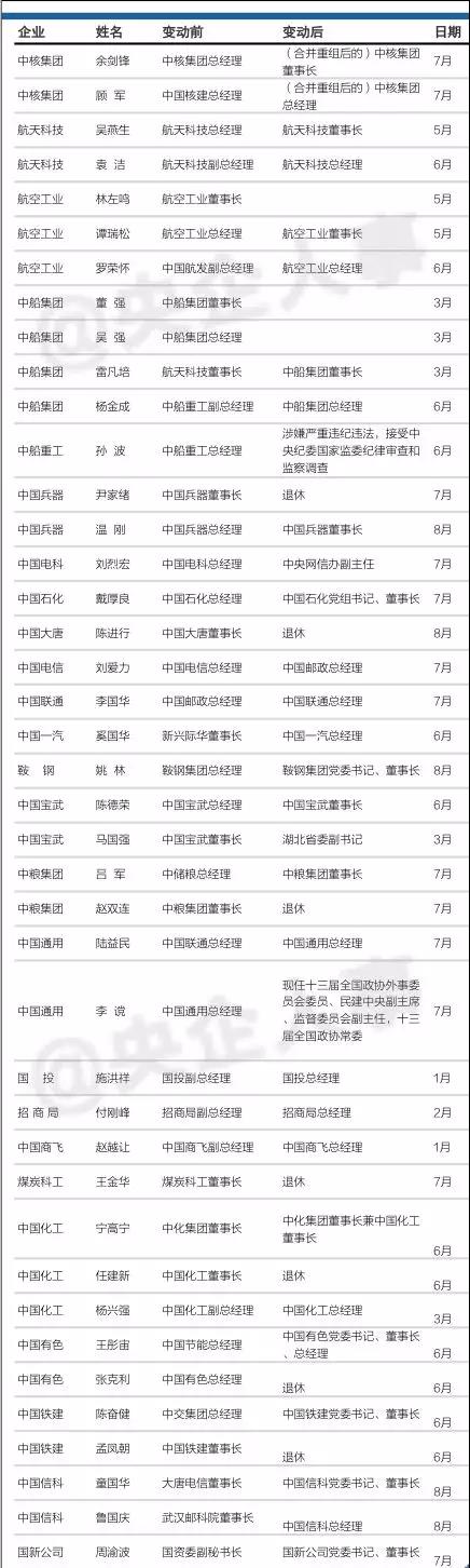 今年年初開始,央企主要負責(zé)人(董事長、總經(jīng)理)的調(diào)整頻率明顯加快。(來源:央企人事 作者:央企人事官)截至2018年8月10日,已有41位央企